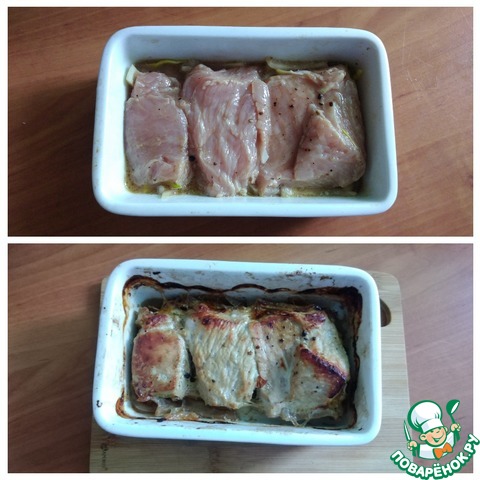 Все продукты взвешены. Разрезала филе на 2 порции по 150 г. Выложила в форму размером - 17Х11 см. Посолила, поперчила, порезала произвольно лук и выложила к индейке.