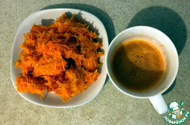 Чистим морковь и тыкву. Натираем их на мелкой терке. В случае мелко натертой моркови и тыквы: отжимаем сок и выпиваем его свежим, пока не начал окисляться на воздухе.