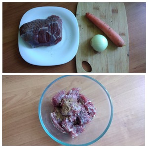 Продукты все взвешены. Кусок говядины должен быть без прожилок и плёнок. Нарезаем говядину кубиком и отправляем в посуду какую-то. Присаливаем, перчим и добавляем мускатный орех молотый. Перемешиваем.