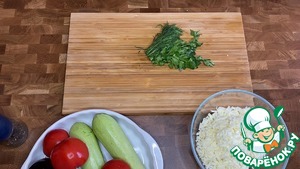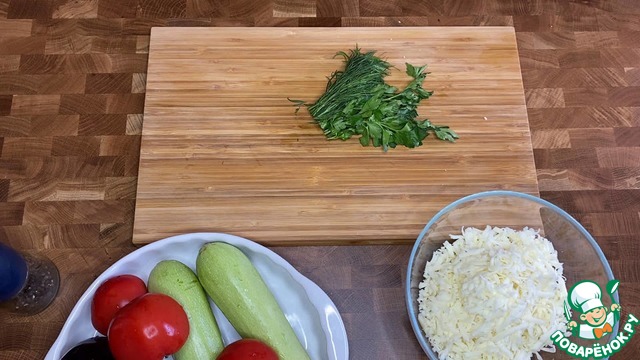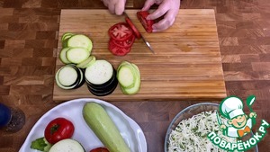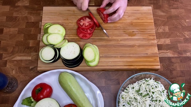 Баклажан, кабачок, помидоры нарезать кружочками одинаковой толщины.