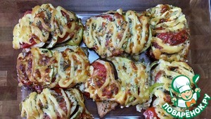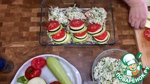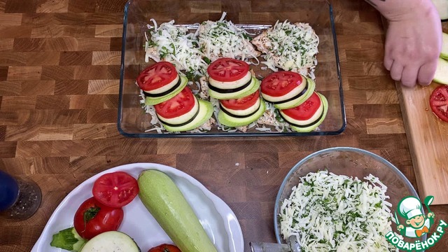 Курицу присыпать небольшим количеством сыра. Овощи выложить на куриное филе. На этом этапе можно добавит чеснок. Иногда я добавляю приправу "Итальянские травы".