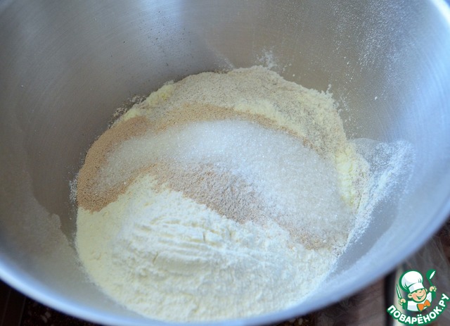 Смешать сухие : оба вида муки, сухое молоко, солод, сахар, соль и дрожжи.