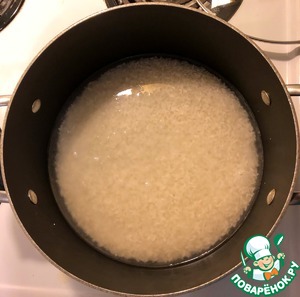 Используем 5-литровую кастрюлю и заливаем рис водой. Слой риса будет тонким, что нам и нужно.