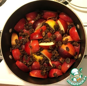 Сверху выкладываем 1 слой накошенных яблок кожурой кверху (плотно друг к другу). Затем выкладываем второй слой из оставшихся яблок. Сверху посыпаем изюмом. Вода не должна покрывать сверху ни яблоки, ни изюм. Варим блюдо на медленном огне в течении 25 минут от момента закипания. Затем оставляем еще на 15-20 минут до полного приготовления риса.