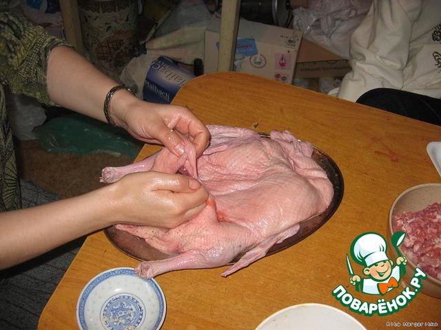 Далее набиваем птичку. Утка - это вам не курица, туда в два слоя блины влезают :-). -