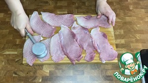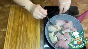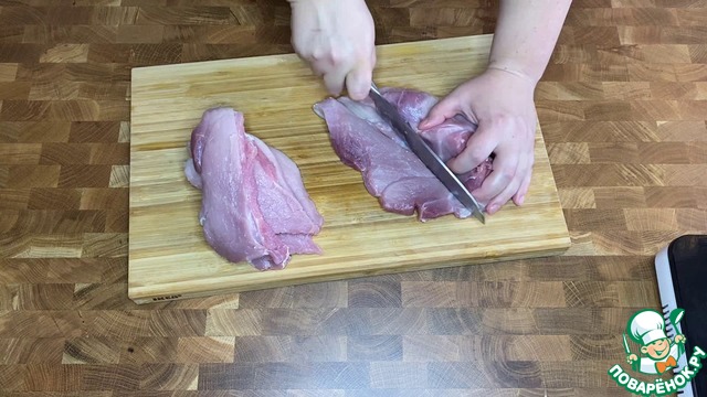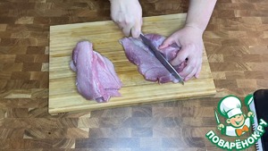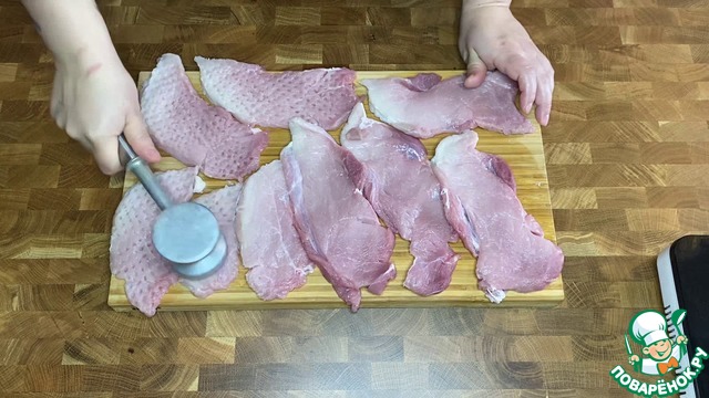 Свинину нарезать порционными кусочками толщиной примерно 1 см (поперёк волокон).