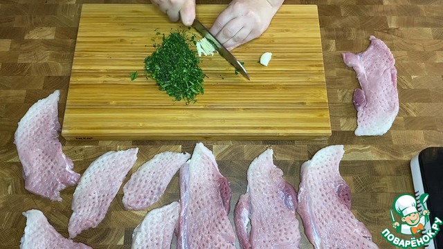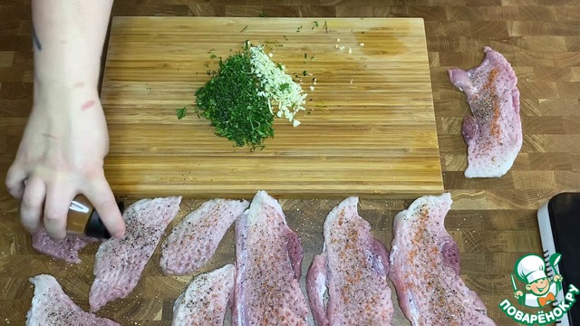 Мясо посолить, поперчить, посыпать нарезанной зеленью и чесноком.