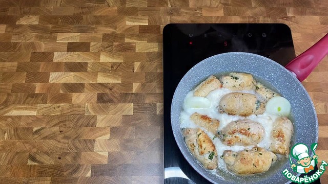 Вернуть рулеты обратно в сковородку. Добавить воду и репчатый лук. Протушить до готовности.