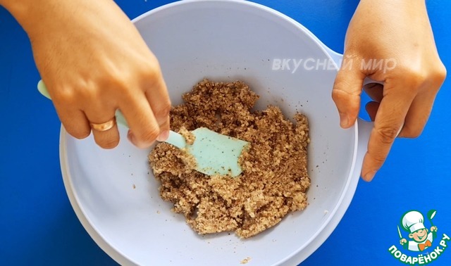 Измельчите орехи в блендере до получения крошки, но не измельчайте орехи в муку. Добавьте сахар и белок, чтобы получилась плотная ореховая начинка, которая не растекается и держит комочек.