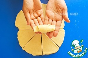 Разделите тесто на 3 равные части. В работу берите одну часть, остальное держите в прохладном месте. Раскатайте одну часть теста в круглый пласт и разрежьте на сегменты: сначала - на 4 части, а затем еще каждый сегмент - на две части. Итого - на 8 сегментов.