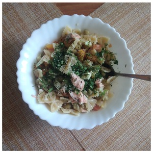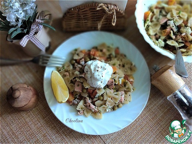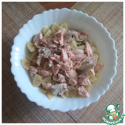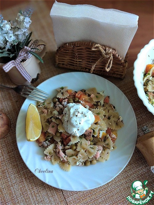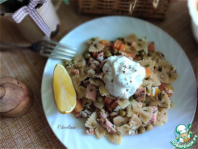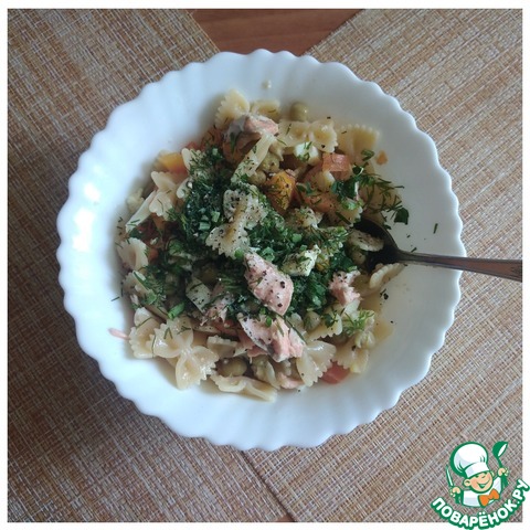 Салат из запечённой красной рыбы с бантиками (Farfalle), яйцом и зелёным горошком. Может вполне быть самостоятельным блюдом.