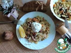Добавляем пасту и рыбу, разобранную руками на небольшие кусочки.