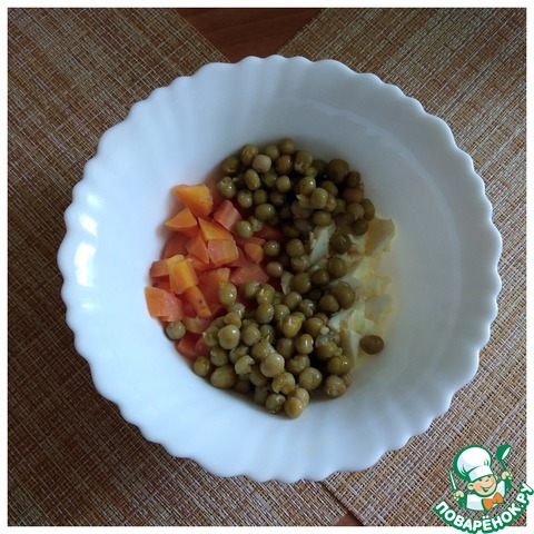 Все продукты взвешены. Морковь нужно запечь в фольге или отварить "в мундире". Яйцо сварить вкрутую. Бантики (Farfalle) отварить аль-денте, следуя указаниям на упаковке. Откинуть на дуршлаг и для салата промыть холодной водой. Рыбу натереть солью и перцем, поместить на форму, полить лимонным соком и оливковым маслом. Запечь в духовке 15 минут при т-180 С. Ориентируйтесь по своей духовке. Я рыбу и морковь в фольге запекала вместе. Морковка у меня мелкая, всего 40 г. Берём салатник, выкладываем в него морковь, яйцо порезанный и зелёный горошек.