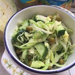 Капусту нарезаем произвольно, немного присаливаем и мнём легко ладонью, чтобы она дала немного сока. Кладём порезанный огурец и зелёный горошек. Добавляем уксус, тмин. Перемешиваем и пробуем на вкус. Если что, то корректируем уксус и соль под себя.