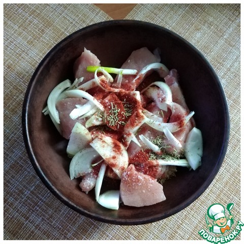 По диете мне предложено любое мясо, только чтобы оно было постное (без жира). Я взяла свинину. Нарезала на куски размером примерно 2Х3 см. Взяла глиняную плошку, где вначале замариную мясо, а затем в ней же и приготовлю.