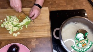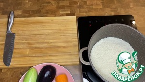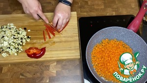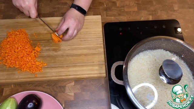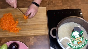 Пока варится рис нарезать овощи. Морковь мелкими кубиками.