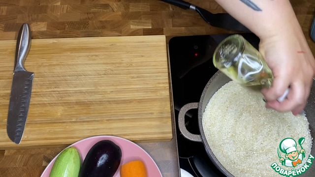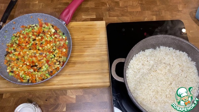 Рис вернуть на огонь. Добавить сливочное масло и приготовленные овощи. Все перемешать.