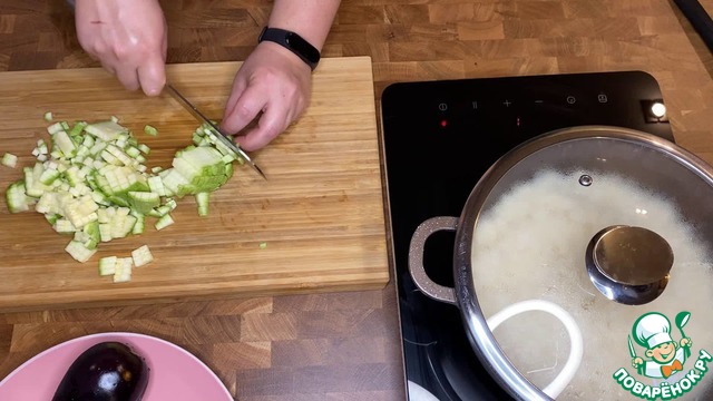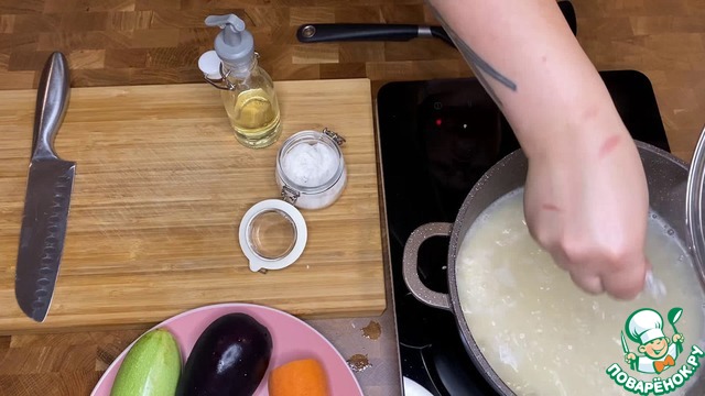 Добавить кипящую воду, посолить. Накрыть крышкой и оставить на медленном огне примерно на 30 минут.