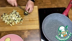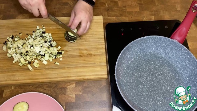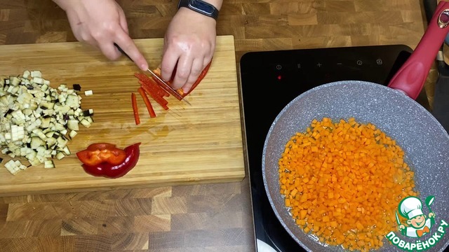 Овощи обжарить на растительном масле. Сначала морковь, затем добавить кабачок, затем баклажан и болгарский перец.