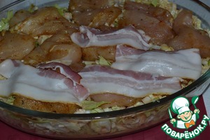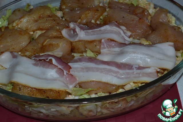 На капусту выложить приправленную курицу, а на каждый кусочек курицы - полоску бекона.
