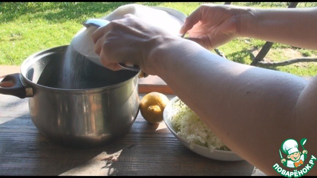 • Пропорции для этого сиропа очень простые- на 10 цветов бузины 1 литр воды, 1 кг сахара и 1 ст л лимонной кислоты. Лимон добавляем по желанию. Соцветия бузины крупные, если у вас небольшие можно брать больше. В ёмкость с водой засыпаем сахар, перемешаем.