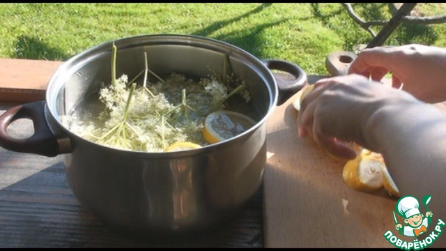 • У меня цветы бузины росли в экологически чистом месте, я их не промывала. Если считаете нужным, сполосните их в воде и закладывайте в ёмкость с сахарной водой. Нарежем кружочками помытый лимон, выложим сверху бузины, ложкой всё поправим, чтобы цветы и лимоны были утоплены в воде. Накрываем крышкой и оставим настаиваться 24 часа.