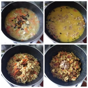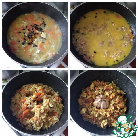 Солим, добавляем барбарис и варим всё на среднем огне 15 минут. ЭТО МЫ ПРИГОТОВИЛИ ЗИРВАК для плова. Успех плова будет зависеть от правильного приготовления зирвака. Очередь риса. Ровным слоем укладываем рис по всей поверхности. Варим под крышкой до впитывания жидкости. Далее собираем рис горкой и делаем отверстия до дна ручкой ложки. Накрываем и готовим рис до полного впитывания жидкости всё так же на среднем огне. Далее перемешиваем всё содержимое сотейника, в центр укладываем вынутый чеснок, убавляем огонь на минимум и под крышкой даём плову упреть
