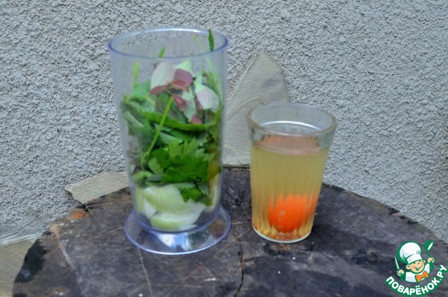 Лук нарезать, у зелени удалить веточки, сложить в блендерный стакан.