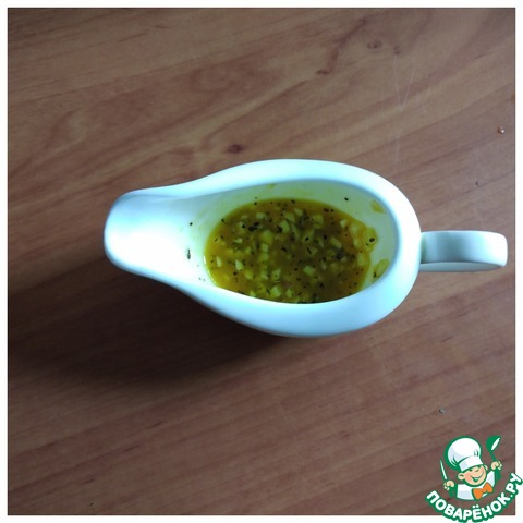 • Делаем для салата заправку. В посуде смешиваем масло горчичное, уксус яблочный, горчицу (у меня дижонская, но не зерновая), мёд, мелко резанный чеснок (чеснок можно выдавить) и базилик (у меня сухой). Заправка готова.