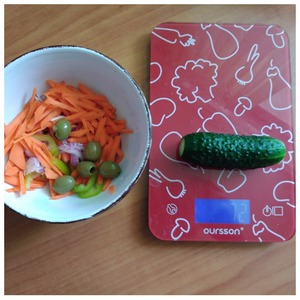 Я делаю так: Ставлю тарелку на весы, выкладываю листья салата, сам салат, поливаю заправкой. Мне нужно по диете готового салата с заправкой 150 г. На фото в тарелке 150 г салата. -