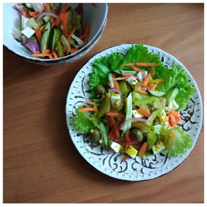 Салат из овощей и феты, заправленный пикантной заправкой на горчичном масле.