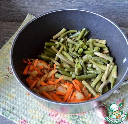 Добавить стручковую фасоль, перемешать, жарить 5 минут.