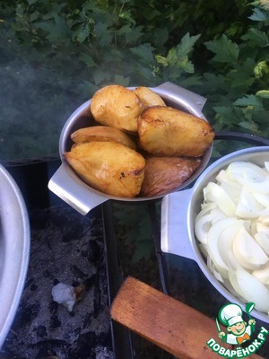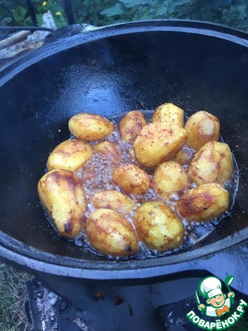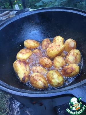 Яблоки достаем и отправляем картофель, жарим до загорелости.