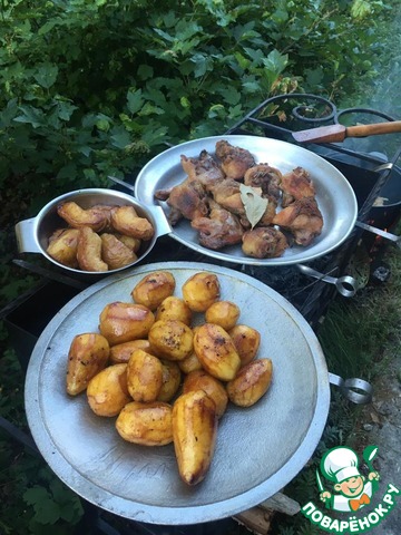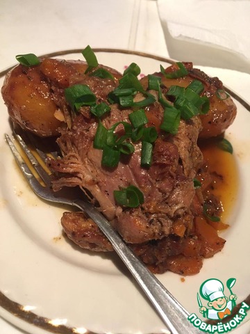 Казан использовала на 6 литров, содержимого хватило на 2 трапезы 4-м человекам. Мясо получается очень нежным, прямо распадается на волокна. Советую попробовать, даже в домашних условиях, оно того стоит и просто в приготовлении.