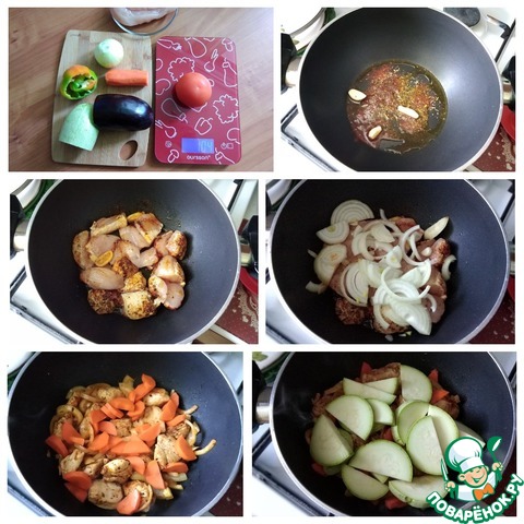 Готовим все продукты для рагу. Баклажан нужно порезать и замочить в подсоленной воде, чтобы вышла горечь. Берём глубокий сотейник. Наливаем масло совсем немного, греем его и выкладываем специи: паприку копчёную и прованские травы, добавляем разрезанный зубчик чеснока. Обжариваем с минуту, чтобы все специи отдали аромат маслу. Филе куриное нарезаем кусочками, не мельчите. Отправляем в сотейник. Так как блюдо диетическое, то сильно не обжариваем кусочки. Хватит с минуту обжарки. Теперь добавляем порезанные произвольно овощи (не мельчите) по порядку каждый с интервалом 1 минута, перемешивая каждый раз: