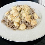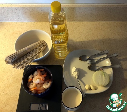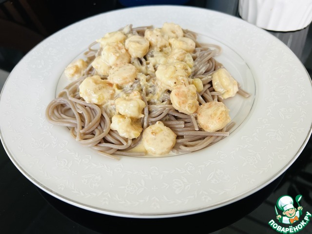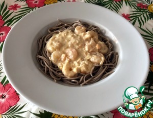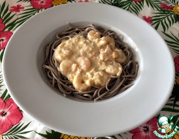 Предлагаю Вашему вниманию рецепт отварной гречневой лапши (собы) с креветками, приготовленными на молочном соусе с добавлением, подсушенного на медленном огне, лука и чеснока.