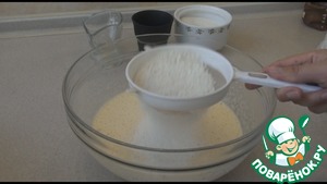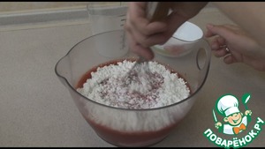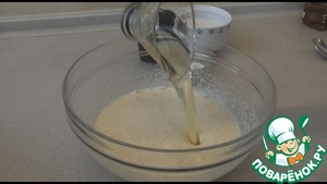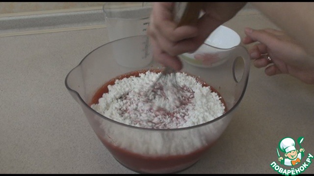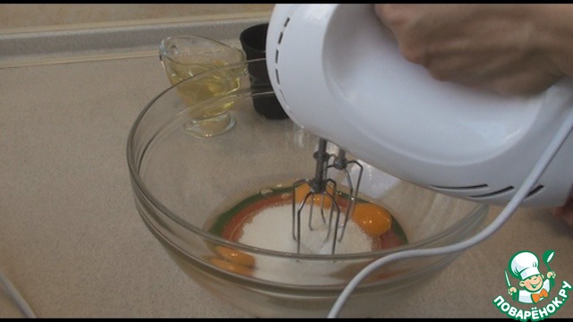 Просеем муку и разрыхлитель. Хорошо размешаем венчиком или миксером тесто.