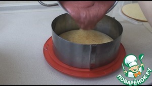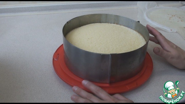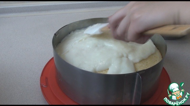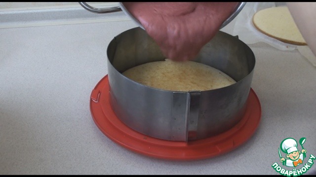 Потом выкладываем нижний корж на поднос, надеваем кондитерское кольцо, если нет, можно использовать форму для выпечки.