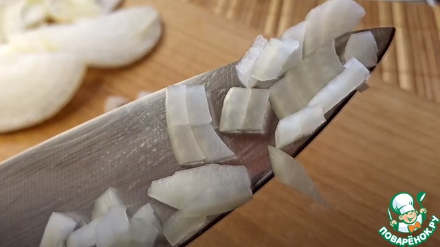 1) Лук репчатый нарезаем маленьким кубиком, перекладываем в тарелку.