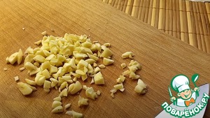 2) Чеснок нарезаем маленьким кубиком, перекладываем к луку. Убираем в сторону.
