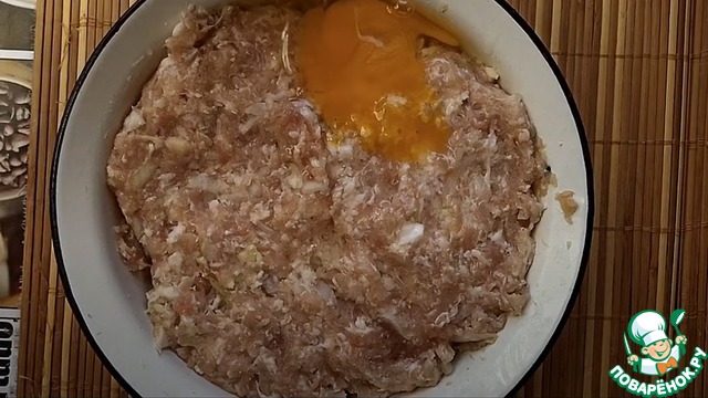 5) Фарш надо заранее разморозить. После этого перекладываем его в миску, солим, перчим, перекладываем лук с чесноком. Все хорошо перемешиваем.