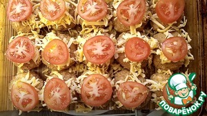 8) На эти шарики укладываем сыр, и помидор. Отправляем в разогретую духовку, до готовности. У меня мясные шарики запекались минут 40. Если у вас скатиться сыр его можно поправить.