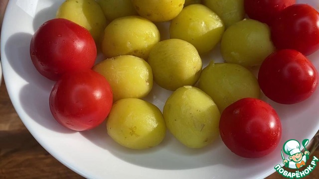 Помидоры черри разрезать на четыре части, а картофель - на две. На фото хочу отразить размер картофеля относительно размера помидор.