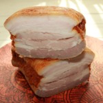 У меня был вот такой кусок грудинки. В народе называемый "галстуком". Вырезается из брюшины от горла и имеет форму треугольника. От сюда и название. По стоимости гораздо дешевле обычной грудинки.