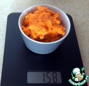 Выжимаем сок из моркови, который можно сразу выпить. В моем случае получилось 158 грамм жмыха.