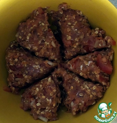 Мелко крошим помидоры. К фаршу добавляем морковный жмых, овсянку, помидоры, чеснок, лук, специи (включая черный молотый перец) и 1 чайную ложку соли. Все хорошо перемешиваем. Разделяем фарш на 6 частей, так как он нам понадобится для заполнения 6 перцев. Кипятим примерно 2-3 стакана воды.