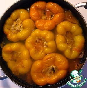 Добавляем лавровый лист, соль и горошины черного перца в промежутки между перцами. Варить на медленном огне (при постоянном небольшом кипении) в течении 40 минут. Первое время необходимо поглядывать (при необходимости временно увеличивать нагревание), чтобы кипение было постоянным, так как требуется некоторое время для полного прогревания фаршированных перцев и последующего стабильного кипения.