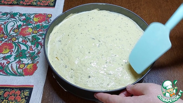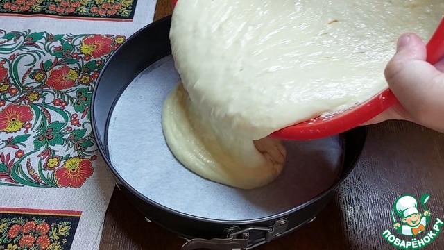 Выпекать буду в разъёмной форме диаметром 24 см. Дно и бортики формы смазала сливочным маслом. Дно ещё застелила пергаментной бумагой. Включаем разогреваться духовку до 180 градусов. Сначала выкладываем творожную начинку и аккуратно лопаточкой её разравниваем.