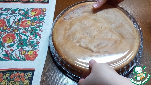 Достаньте пирог из духовки и дайте ему полностью остыть. В процессе остывания он немного осядет, но в этом нет ничего страшного. Достаем пирог из формы и переворачиваем творожной начинкой вверх. Бисквит оказывается снизу.