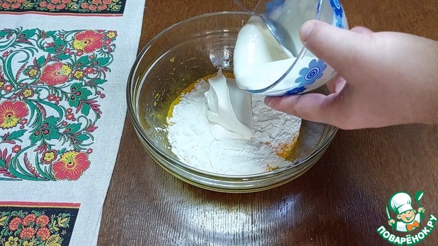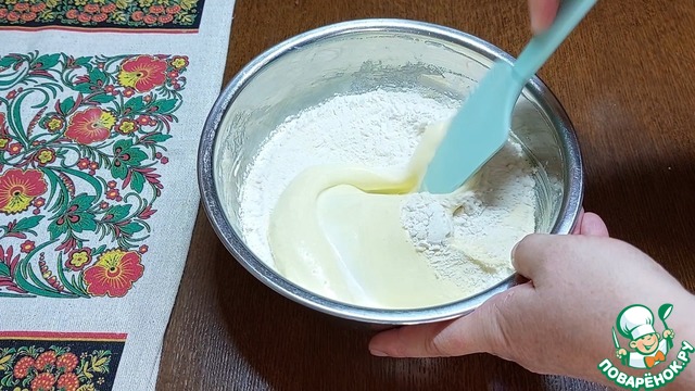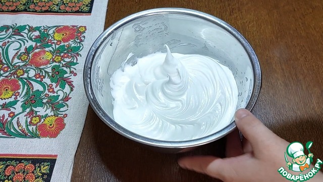 Просеиваем 80 г пшеничной муки и аккуратно перемешиваем, чтобы масса не утратила свою пышность.